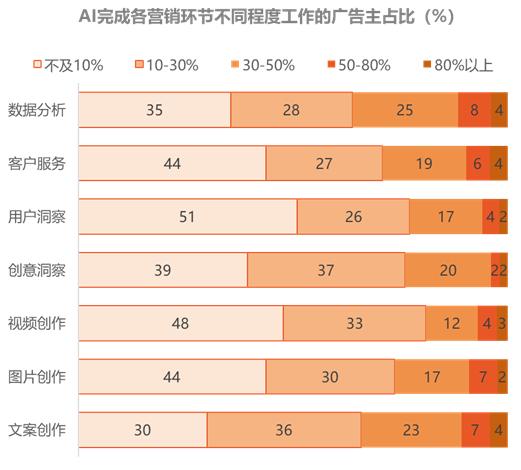 AI技术正在引发营销全链条变革,在消费者洞察、流程自动化以及全链路智能化等领域中得到广泛应用。广告主各个营销环节都不同程度有AI来赋能,其中过半广告主表示其由AI完成的营销工作已超10%。AI应用已经进入快速普及和实践应用阶段,人机协同的关系正逐渐深化。广告主正在AI基建、战略方向、组织建设、场景实践和合法合规方面加速布局,抢占未来发展先机。例如,有广告主谈到公司正在筹备需求会,会将AI应用从客服层面转到更业务、更加创新的方向。