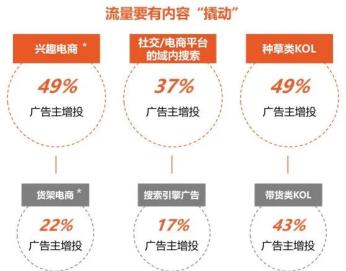 如今,内容为王已经不再是一句口号,而是可以付诸实践并可衡量的。广告主认为内容可以为流量注入“温度”,内容与流量也可以形成高度融合,在付费流量投入产出不尽如人意的情况下,可通过有温度的内容、适配的平台或KOL实现内容与流量的联动。报告显示,在兴趣电商、社交/电商平台内的域内搜索、种草类KOL等具有内容属性的流量平台或营销方式上,广告主有明显的增投态势。